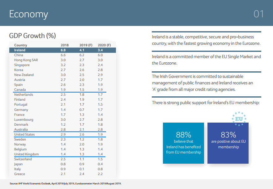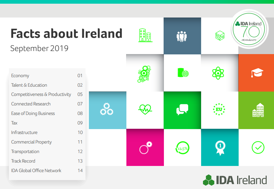 近日,愛(ài)爾蘭投資發(fā)展局(IDA)公布了2019年最新的Facts about Ireland。報(bào)告用清晰的數(shù)據(jù),呈現(xiàn)了愛(ài)爾蘭在經(jīng)濟(jì)、教育、全球競(jìng)爭(zhēng)力、稅收等方面的全球排名和地位。