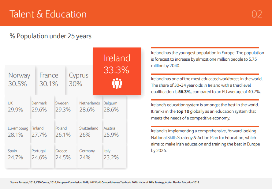 愛(ài)爾蘭的確擁有歐洲最年輕的人口,25歲以下群體占愛(ài)爾蘭人的1/3。愛(ài)爾蘭沿用英式教育,教育系統(tǒng)排名全球前十,近30%學(xué)生在科學(xué)、技術(shù)、工程和數(shù)學(xué)(STEM)領(lǐng)域深造。愛(ài)爾蘭30-34歲的年輕人中有56.3%接受了高等教育,位居歐洲第一。同時(shí),愛(ài)爾蘭在吸引和留住國(guó)際人才方面排名全球第一。