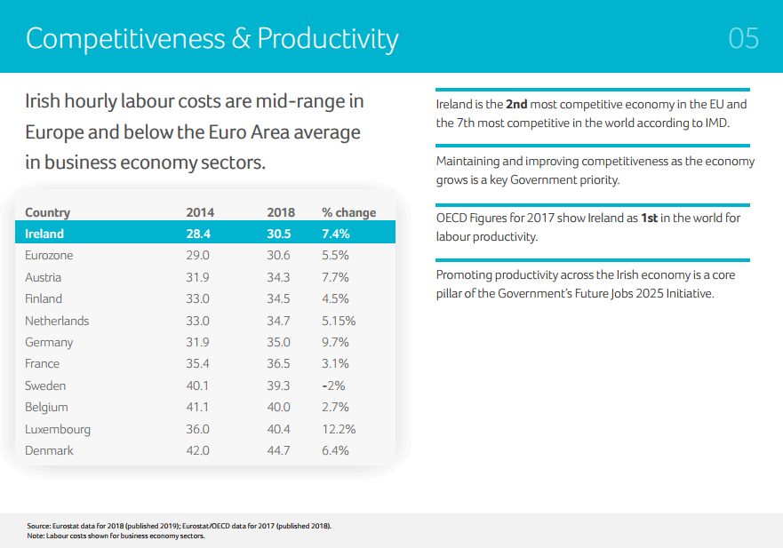 據(jù)IMD報(bào)告,愛(ài)爾蘭是歐盟第二大及全球第七大最具競(jìng)爭(zhēng)力經(jīng)濟(jì)體。另?yè)?jù)經(jīng)合組織(OECD)報(bào)告,愛(ài)爾蘭勞動(dòng)力被列為世界上生產(chǎn)效率最高的勞動(dòng)力。2011-2017年度IBM全球區(qū)域趨勢(shì)報(bào)告,愛(ài)爾蘭更是連續(xù)6年蟬聯(lián)“吸引全世界高價(jià)值項(xiàng)目投資”全球第一。