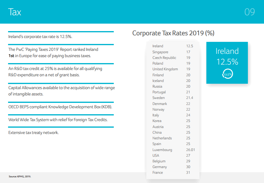 愛(ài)爾蘭企業(yè)稅率僅12.5%,據(jù)PwC發(fā)布的“Paying Taxes 2019”報(bào)告,愛(ài)爾蘭在企業(yè)稅收優(yōu)惠方面,排在歐洲首位。得益于愛(ài)爾蘭優(yōu)惠的稅收政策及利商的經(jīng)濟(jì)環(huán)境,在愛(ài)爾蘭投資的跨國(guó)公司中,有1/3企業(yè)已在愛(ài)爾蘭開(kāi)展業(yè)務(wù)20余年。