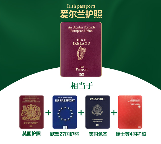 獲得愛爾蘭護(hù)照,不僅可以全球各地來去自如,還能自由定居英國、瑞士、歐盟27國(德、法、意、荷等),輕松移居美國!