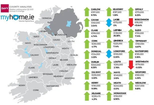以下為2021年第二季度愛爾蘭各地區平均房價及上漲幅度。