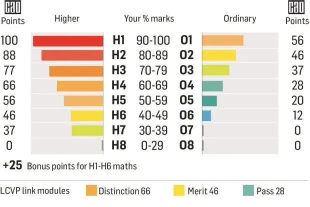 同時,愛爾蘭高考成績直達(dá)英國名校,高級水平均分80就達(dá)牛津錄取線。愛爾蘭高考成績被英國UCAS所承認(rèn),相當(dāng)于英國高考成績,可直接申請英國大學(xué),不需要再考取A-Level成績或進(jìn)行學(xué)歷認(rèn)證等繁瑣步驟。具體的成績兌換標(biāo)準(zhǔn)如下圖所示: