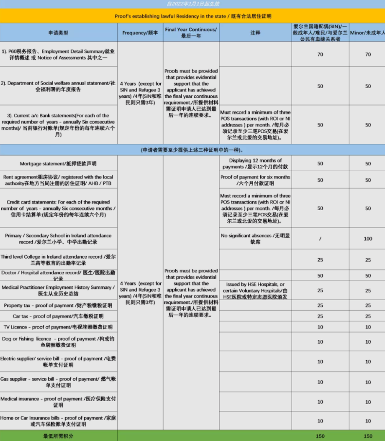 積分制的引入,使申請人更加明確需提供哪些文件證明,以成功獲取公民身份。根據愛爾蘭移民局官網公布的積分細則,申請者需要在身份認證(Identity)和居住證明(Residency)兩方面均滿足每年150分的積分要求。