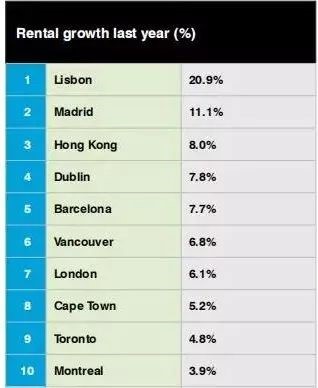 租金漲幅榜前十排名中,歐洲城市占據五個席位,葡萄牙的里斯本的住宅租金以20.9%的增速位居全球第一。西班牙馬德里以11.1%的增速位居第二位,巴塞羅那以7.7%的成績躋身前五,愛爾蘭都柏林位居第四。