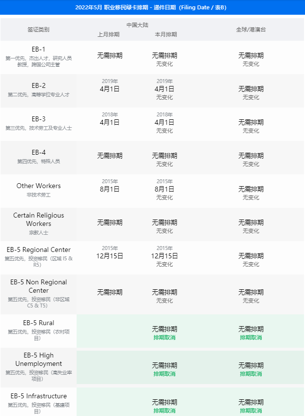 ·由于EB-5新政為三類項(xiàng)目(鄉(xiāng)村、高失業(yè)地區(qū)、基建)預(yù)留了簽證配額,他們成為排期表中的新成員,目前處于無(wú)排期狀態(tài)。
