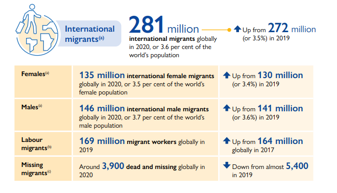 總體而言,全球移民人數在過去50年里不斷增加。盡管 COVID-19 對全球流動性造成了干擾,2020年仍有近2.81億人居住在非出生國,比2019年(2.72億)多出900萬人,比1990年(1.53億人)多出約1.28億人,是1970年(8400萬人)的三倍多。