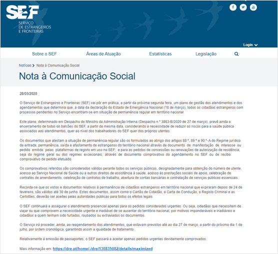 葡萄牙移民局將目前處于等待狀態的移民身份合法化,所有在葡萄牙移民局已經提出申請的外國公民身份都將在葡萄牙本國得到承認,只需持有在3月18日宣布國家緊急狀態之日前向移民局提出的申請憑證。此類文件可充當臨時居留,持有此類文件在葡居留將視為合法居留,可享受本國所有醫療保障及社會保障等。