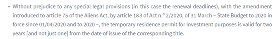 今年4月,葡萄牙頒布了第2/2020號法令,其中的第183條對移民法里居留卡的有效期進行了修改,將黃金居留卡的首次有效期由1年調整為2年。盡管法案已經(jīng)生效,但卻缺乏法案的具體執(zhí)行細節(jié)。