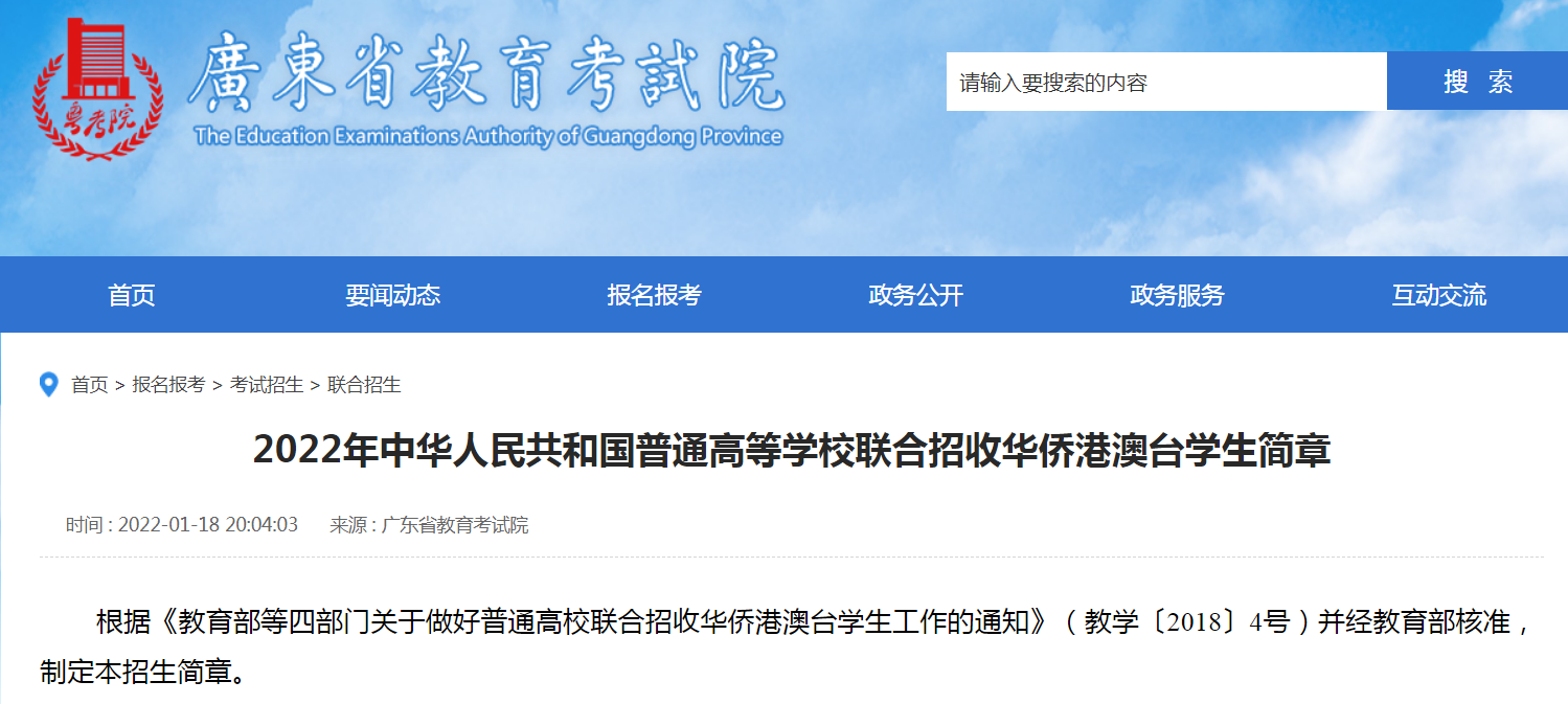 2022年1月18日,廣東省教育考試院發(fā)布了《2022年中華人民共和國普通高等學(xué)校聯(lián)合招收華僑港澳臺學(xué)生簡章》。那么,2022年華僑港澳臺學(xué)生全國聯(lián)招的報名條件、報名時間、考試科目、考試時間地點及志愿填報是怎樣的?下面我們一起來了解一下。