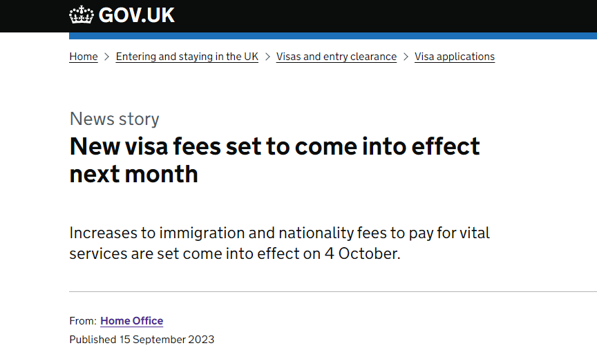英國內政部9月15日發布公告:自2023年10月4日起,英國旅游簽證、學生簽證及工作簽證等多項簽證費用全面上漲,不同簽證類型在英國境內/境外的申請費用漲幅各異,下面我們具體看看都有哪些變化吧!也提醒近期有英國簽證辦理需求的小伙伴們,抓緊辦理哦!