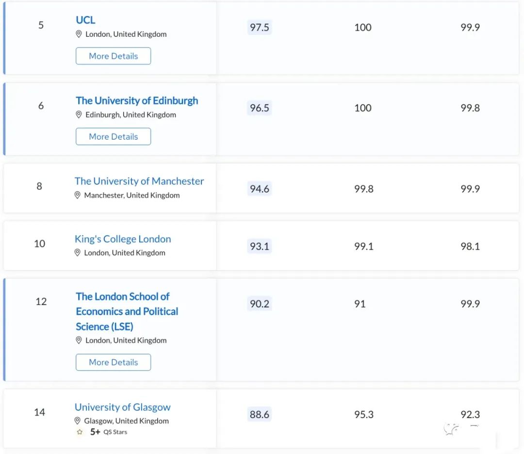 而縱觀2024 QS歐洲大學,英國大學不僅上榜數量最多,排名也非常靠前,在歐洲Top10中英國大學包攬了7席!分別是:牛津,劍橋,帝國理工,UCL,愛丁堡,曼大,倫敦國王學院。